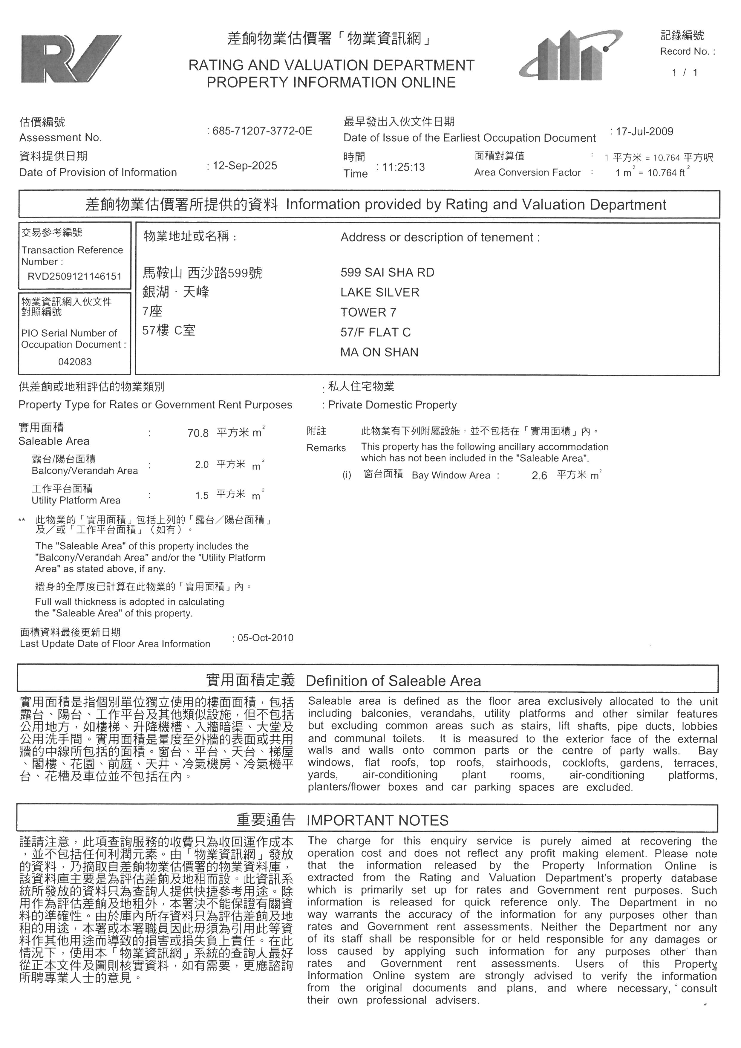 馬鞍山 銀湖.天峰 7座 57C 更新日期 : 2025-10-10