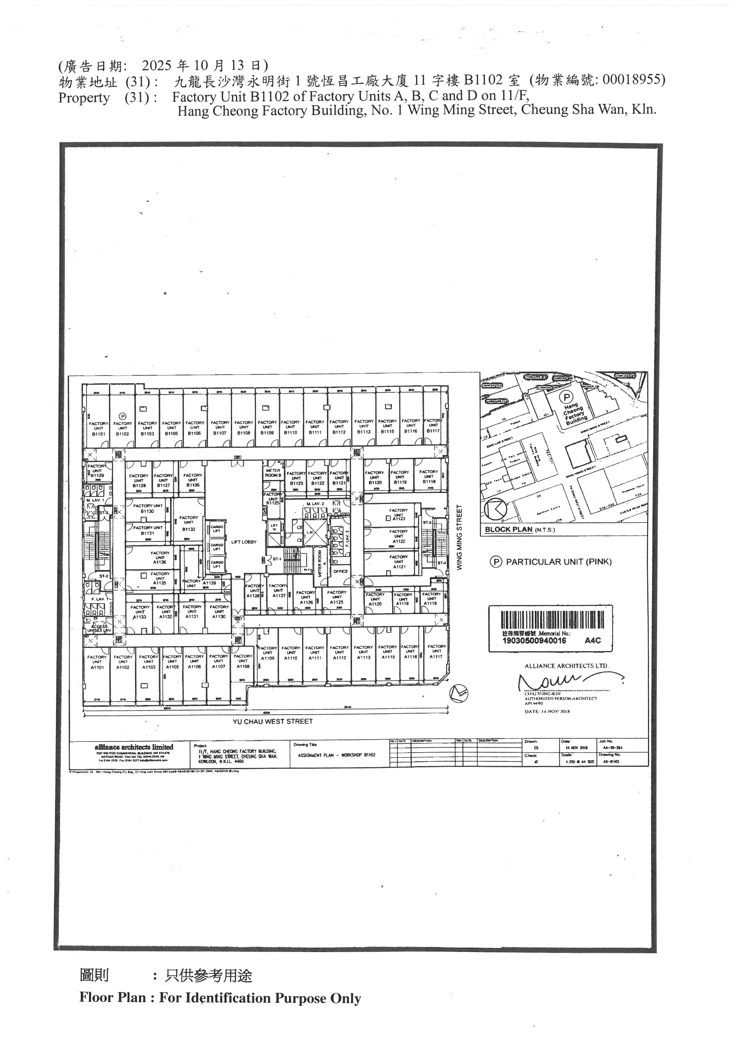 Factory Unit B1102 of Factory Units A, B, C and D on 11/F, Hang Cheong Factory Building, No. 1 Wing Ming Street, Cheung Sha Wan, Kln.