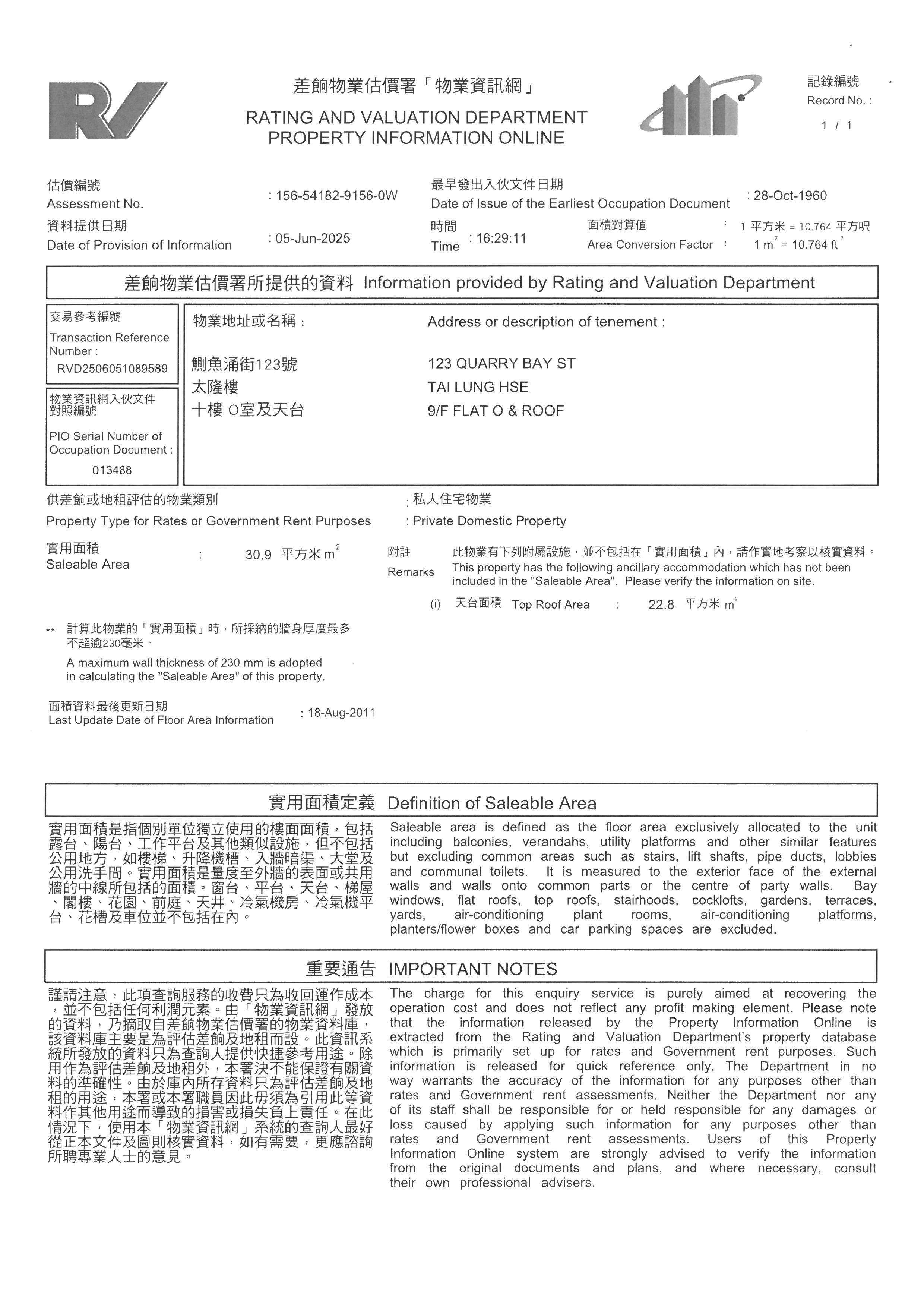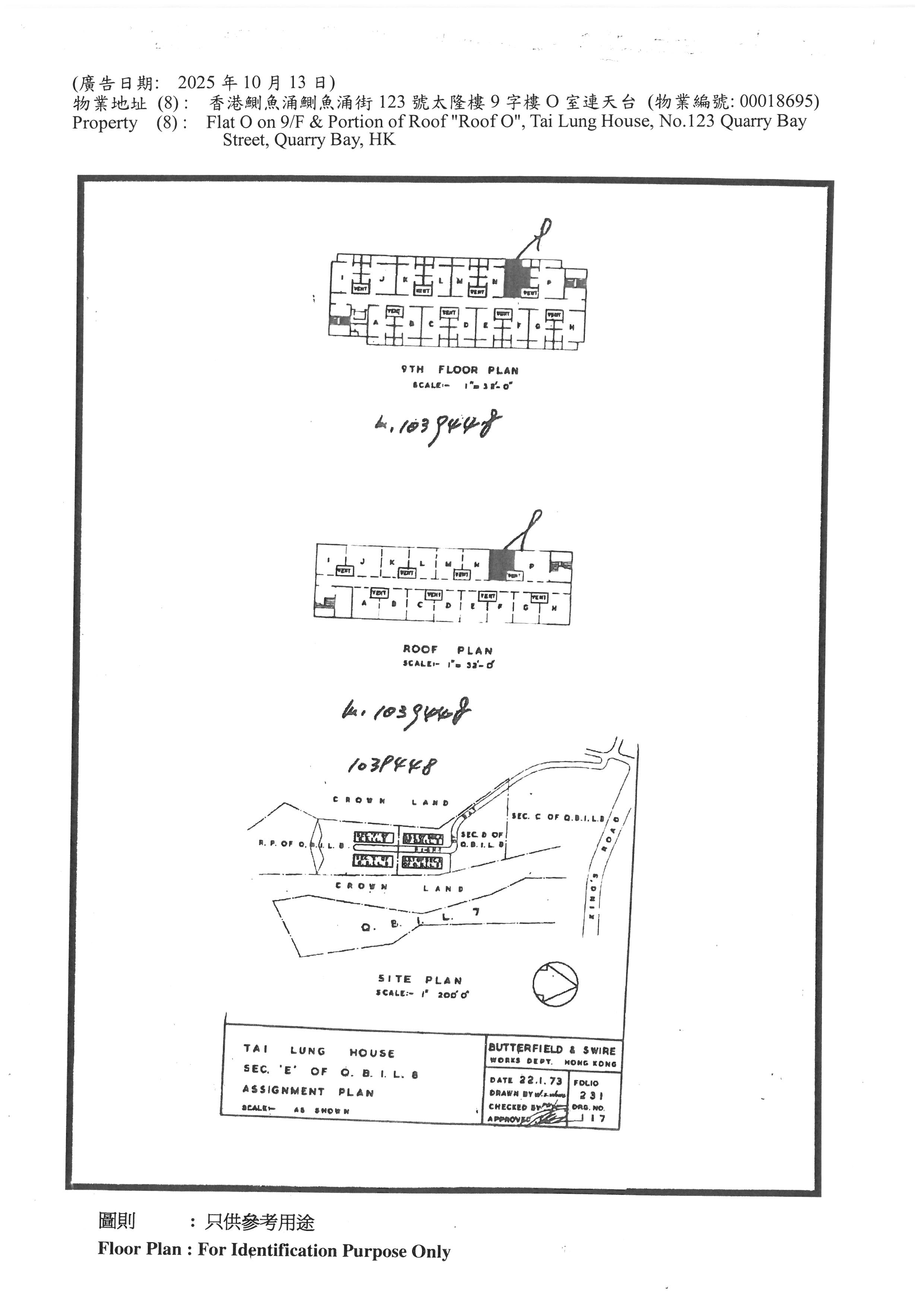 Flat O on 9/F & Portion of Roof O, Tai Lung House, No.123 Quarry Bay Street, Quarry Bay, HK