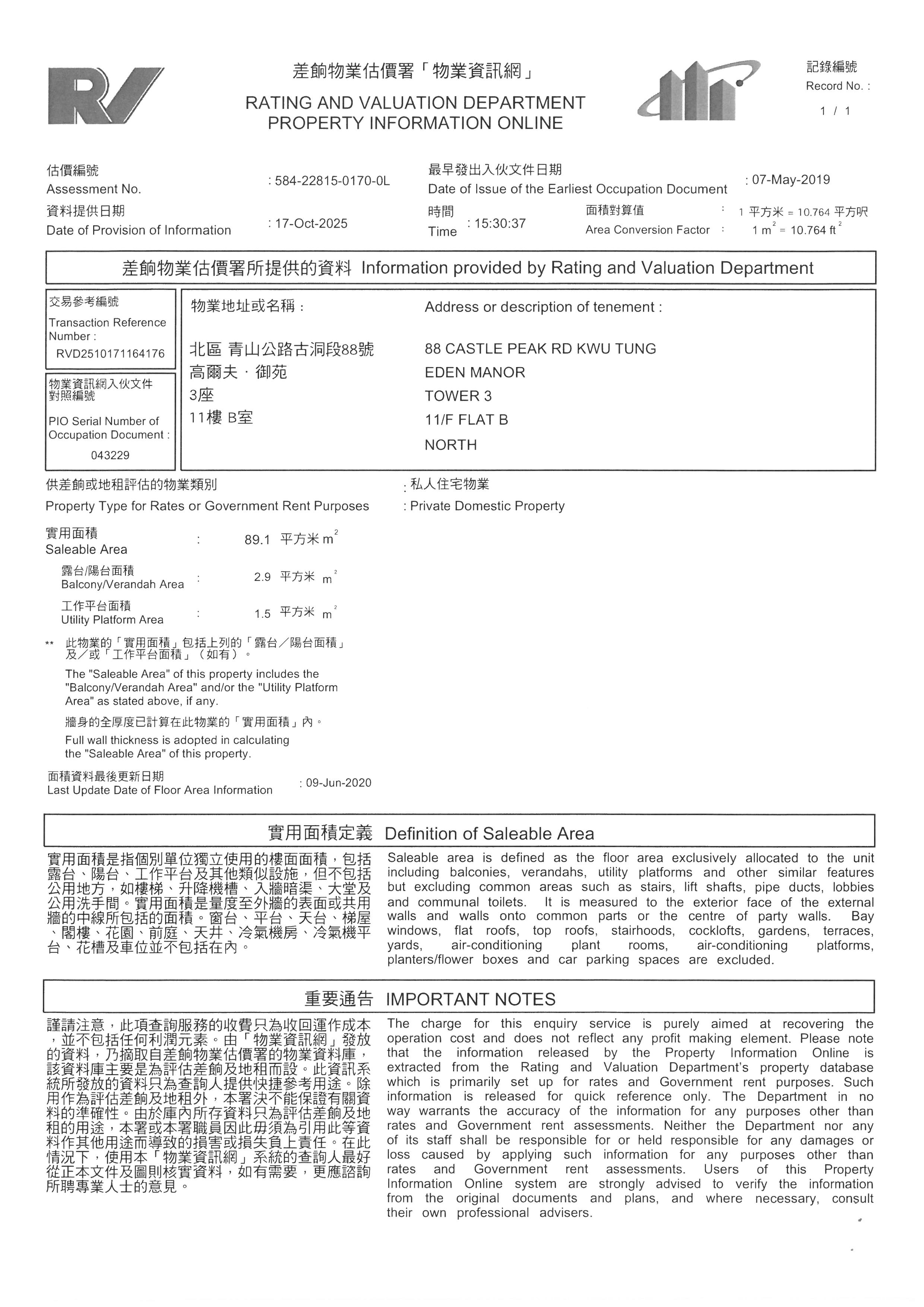 新界上水青山公路古洞段88號高爾夫.御苑3座11字樓B室連露台及工作平台 (物業編號: 00018991)