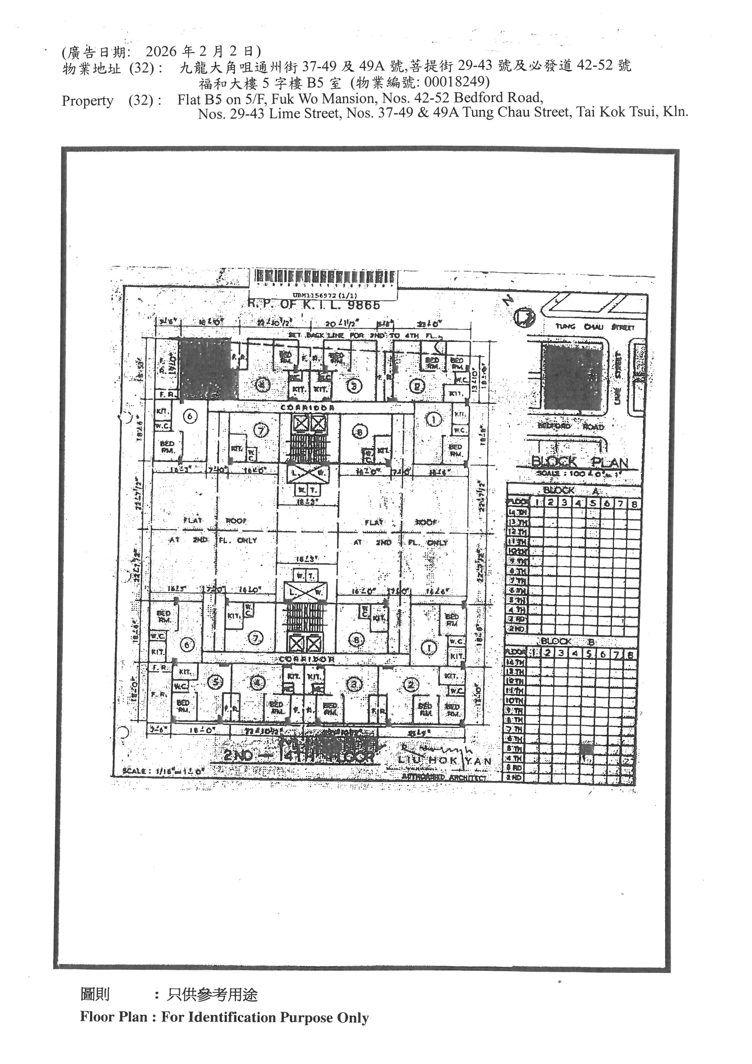 Flat B5 on 5/F, Fuk Wo Mansion, 42-52 Bedford Road, 29-43 Lime Street, 37-49 & 49A Tung Chau Street, Tai Kok Tsui, Kln.