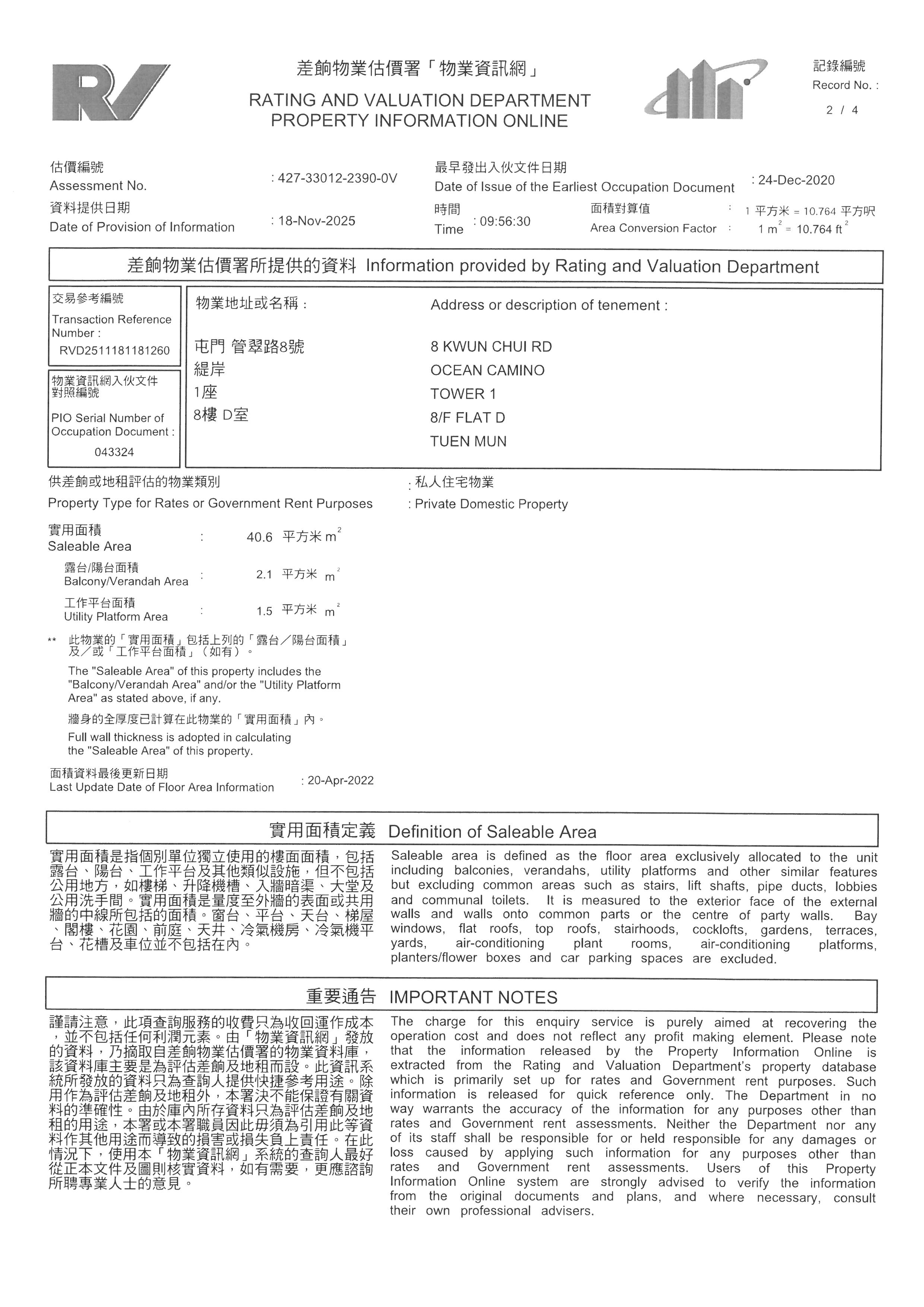 屯門 緹岸 1座 8D室 更新日期 : 2026-03-04