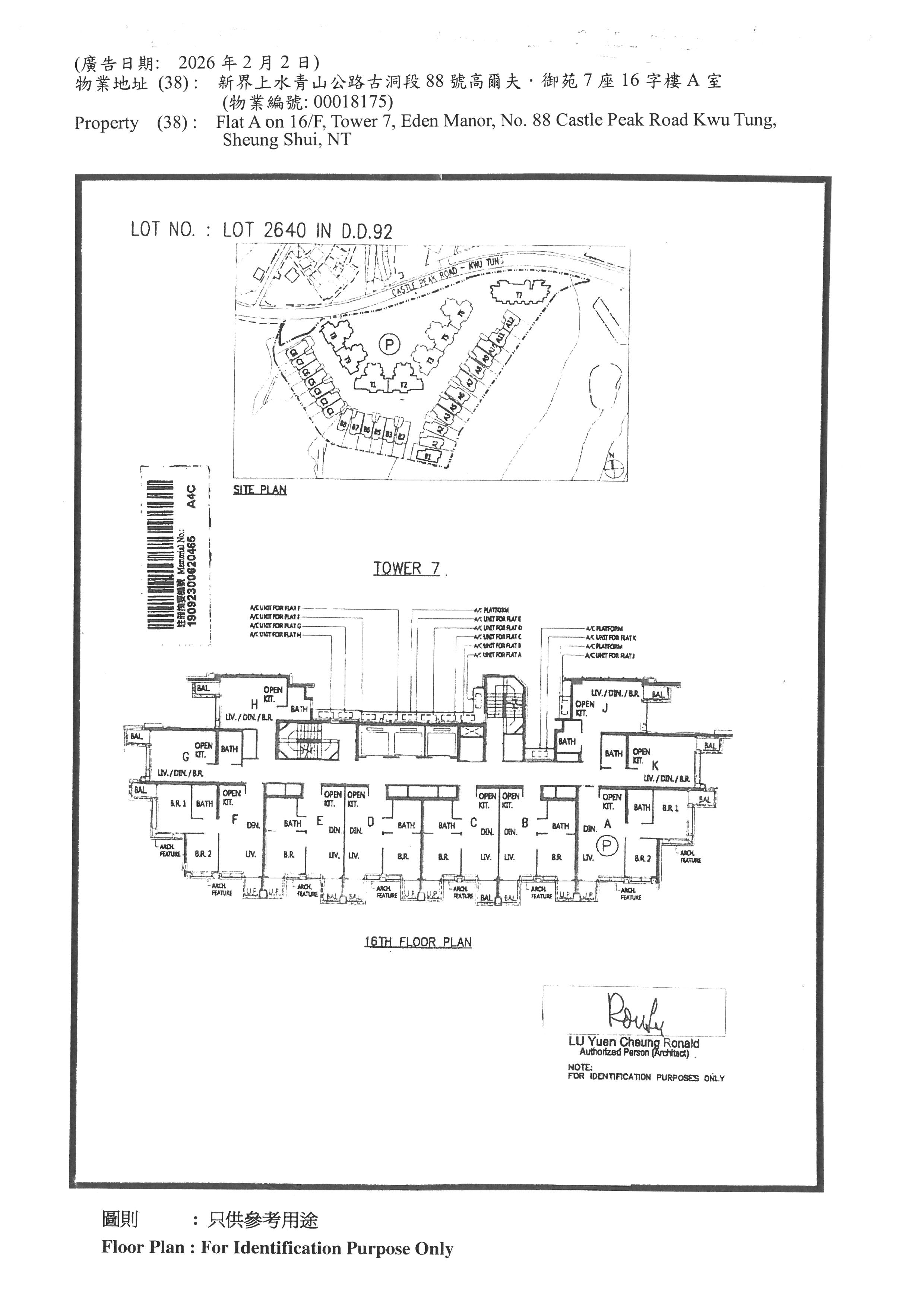 新界上水青山公路古洞段88號高爾夫.御苑7座16字樓A室連露台及工作平台 (物業編號: 00018175)