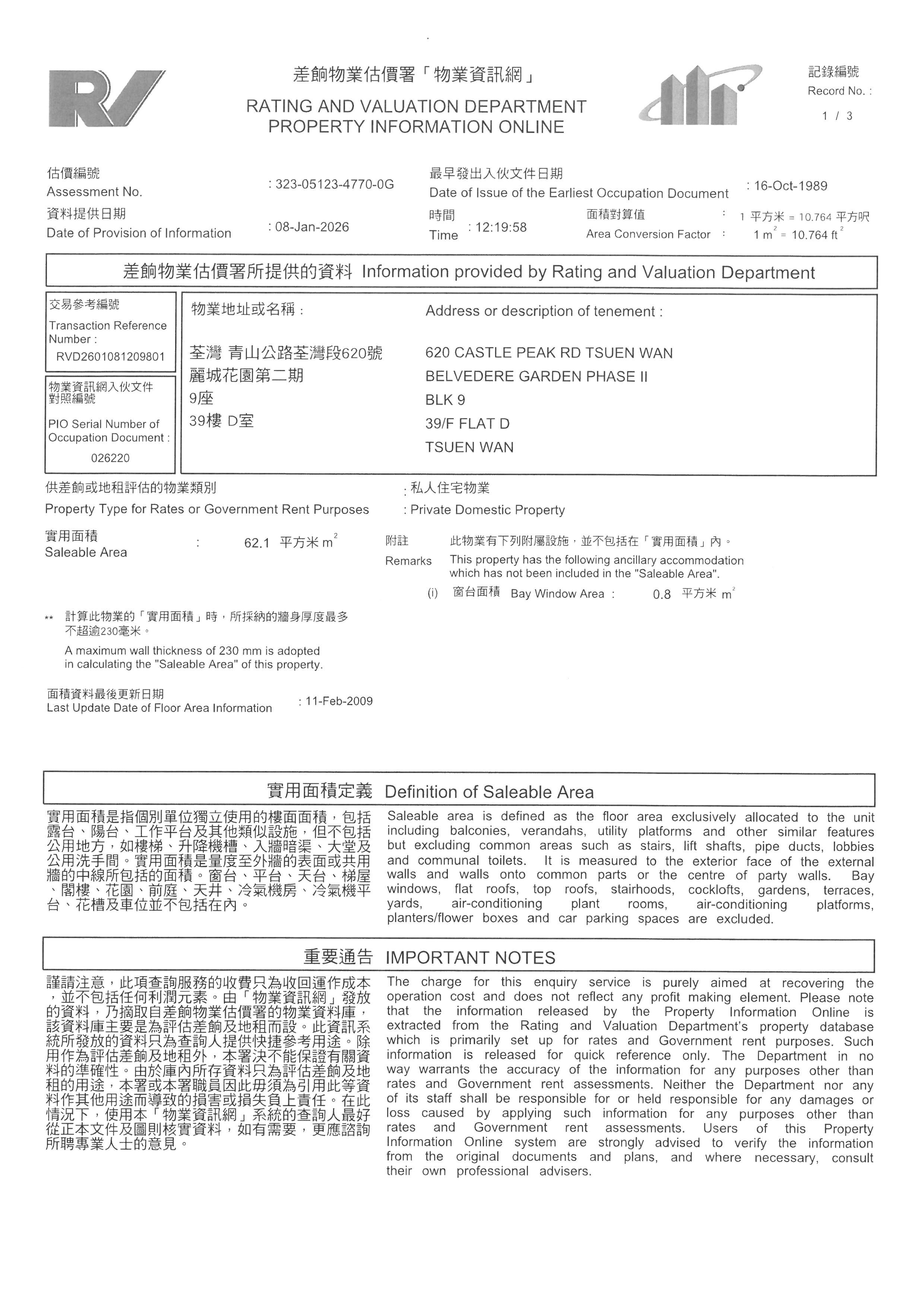 新界荃灣青山公路荃灣段620號麗城花園2期9座39字樓D室 (物業編號: 00019169)