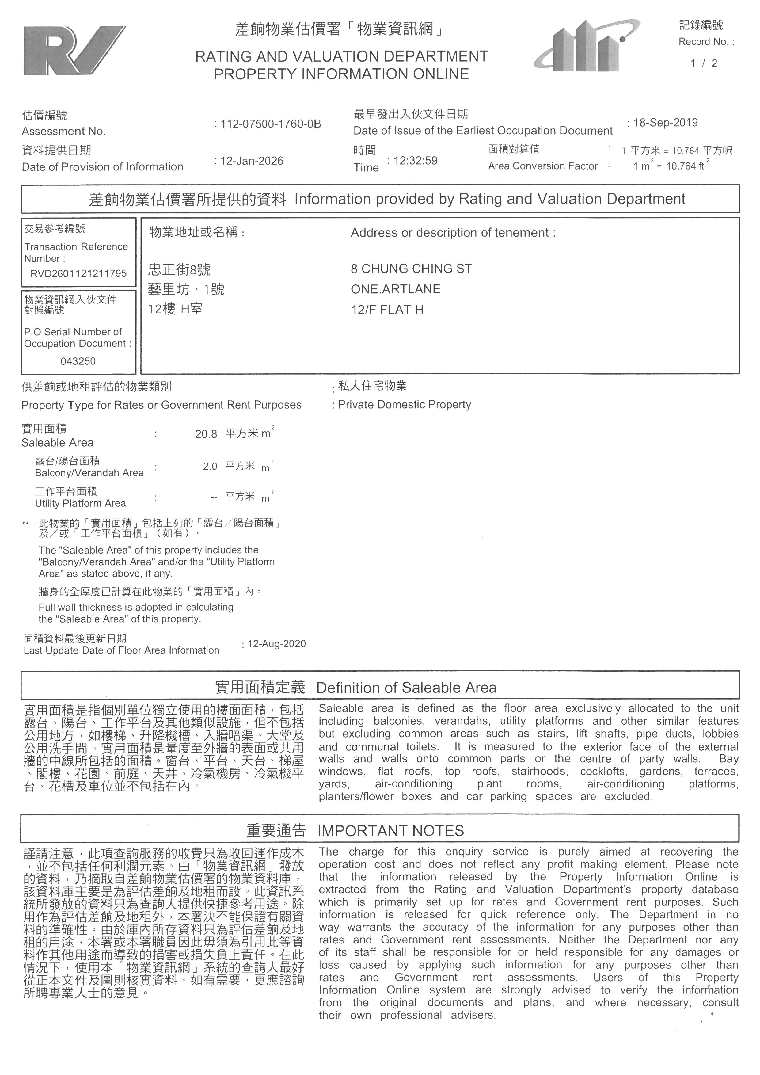 香港西營盤忠正街8號藝里坊1號12字樓H室連露台 (物業編號: 00019178)