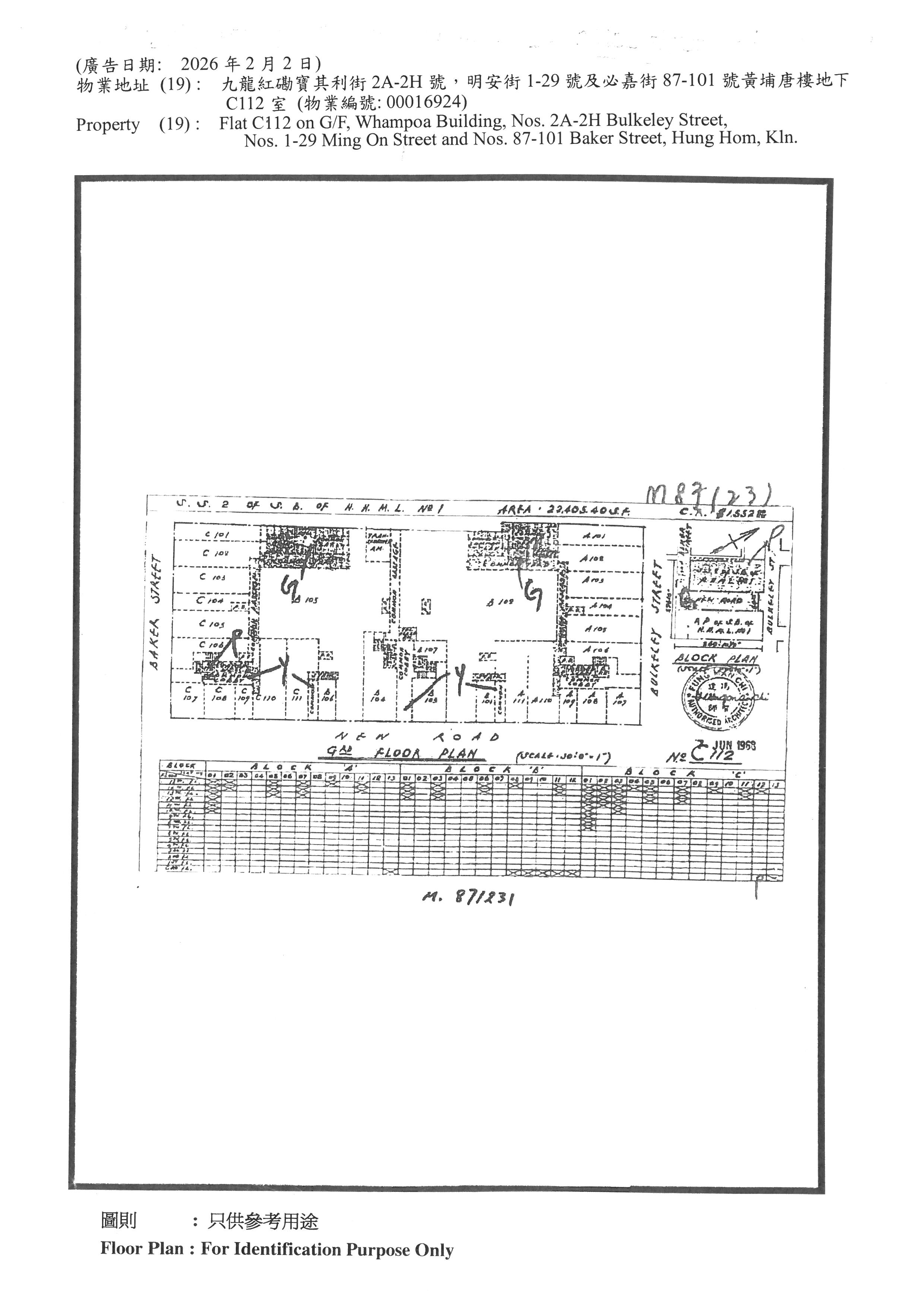 Flat C112 on G/F, Whampoa Building, Nos. 2A-2H Bulkeley Street, Nos. 1-29 Ming On Street and Nos. 87-101 Baker Street, Hung Hom, Kln.