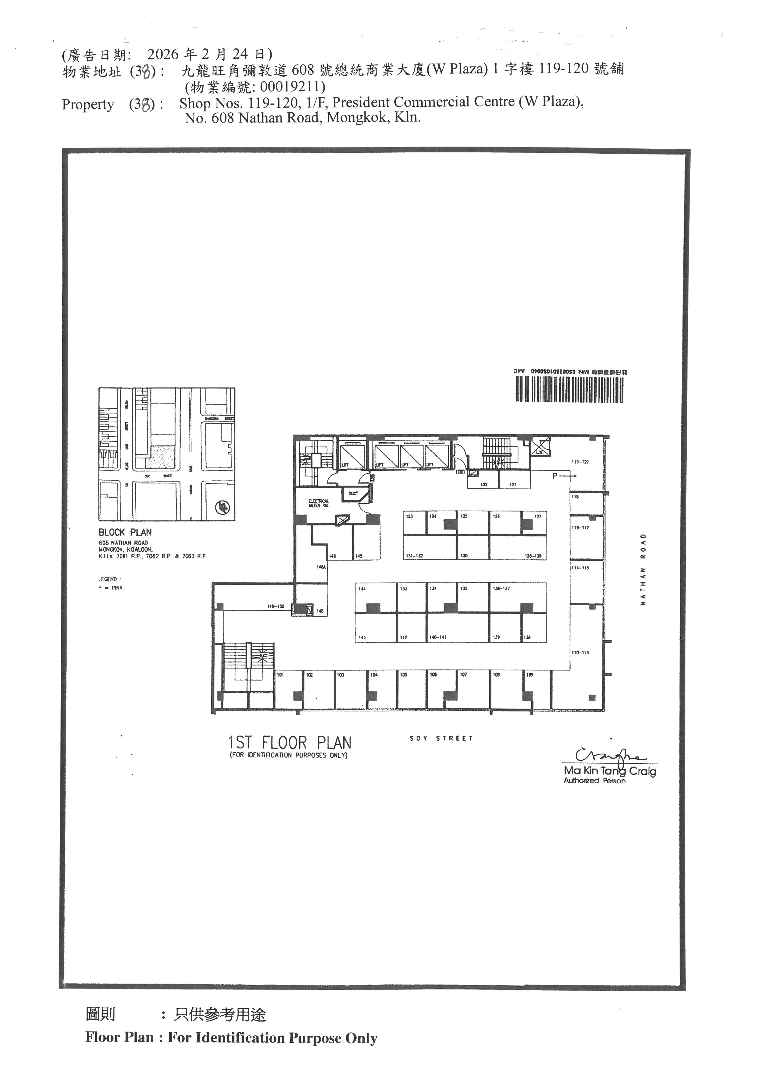 九龍旺角彌敦道608號總統商業大廈(W Plaza) 1字樓119-120號舖 (物業編號: 00019211)