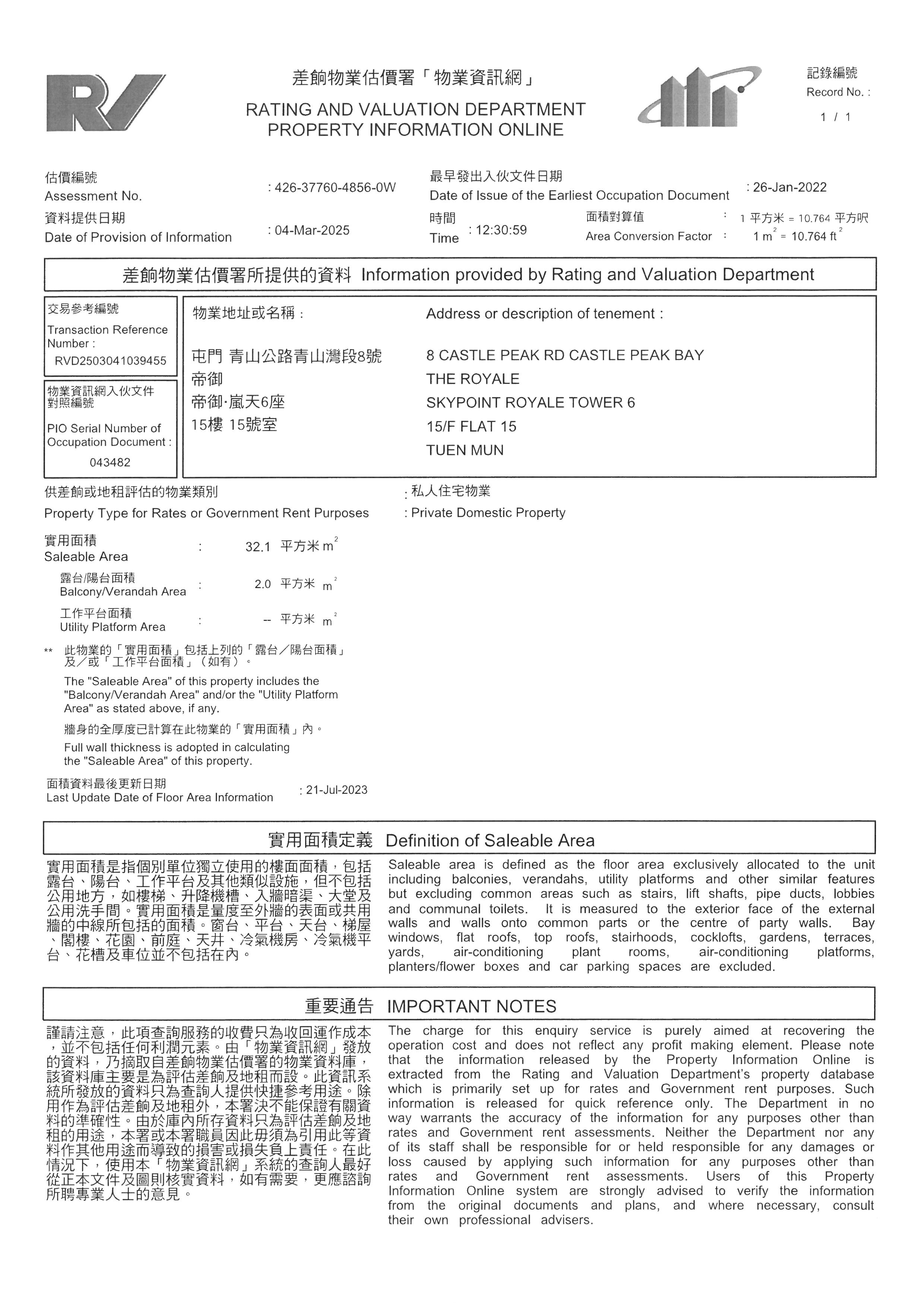 新界屯門青山公路青山灣段8號帝御3期帝御.嵐天 6座15字樓15室及露台 (物業編號: 00018500)