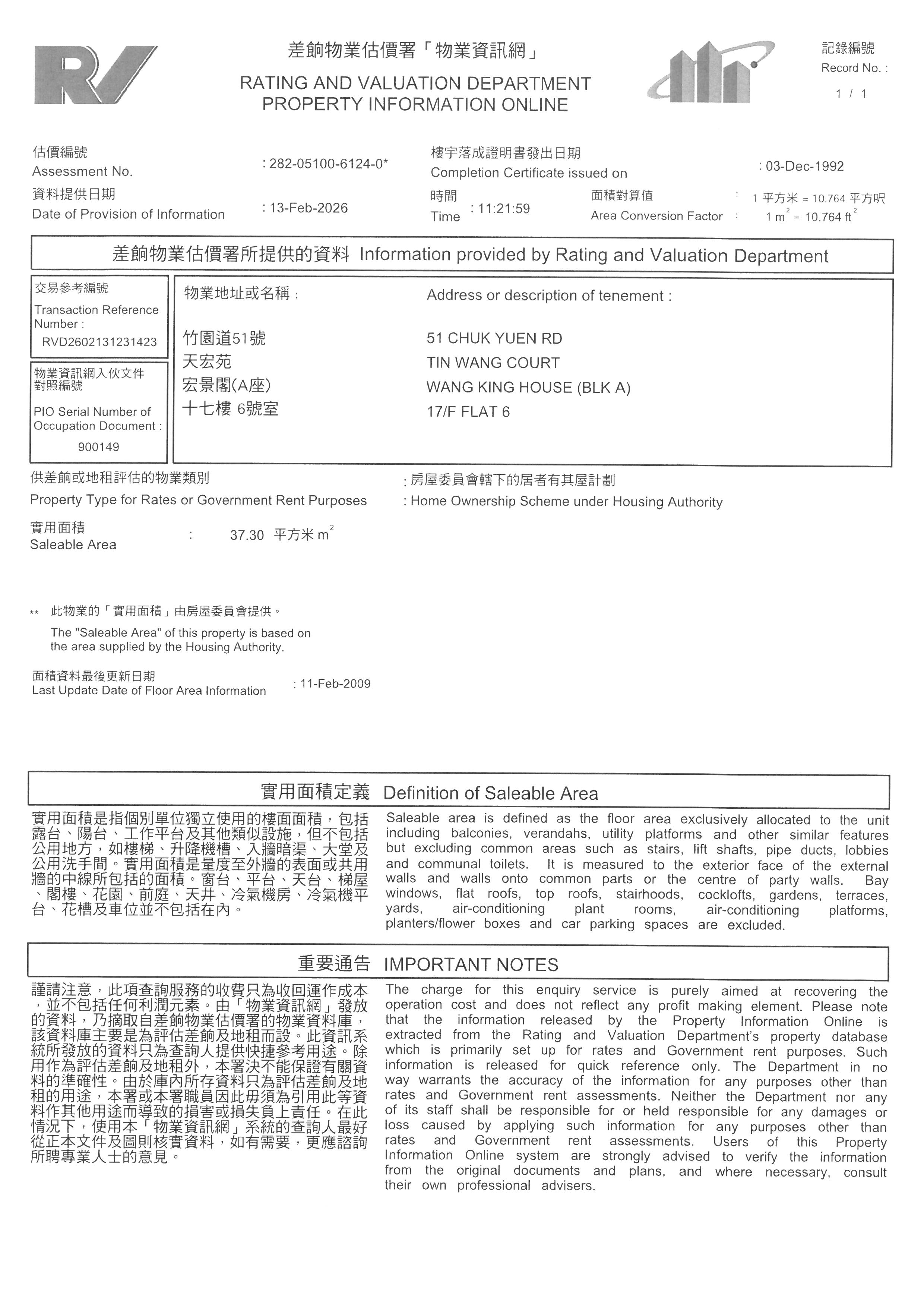 九龍黃大仙竹園道51號天宏苑A座(宏景閣)17字樓6室(第二市場) (物業編號: 00019245)