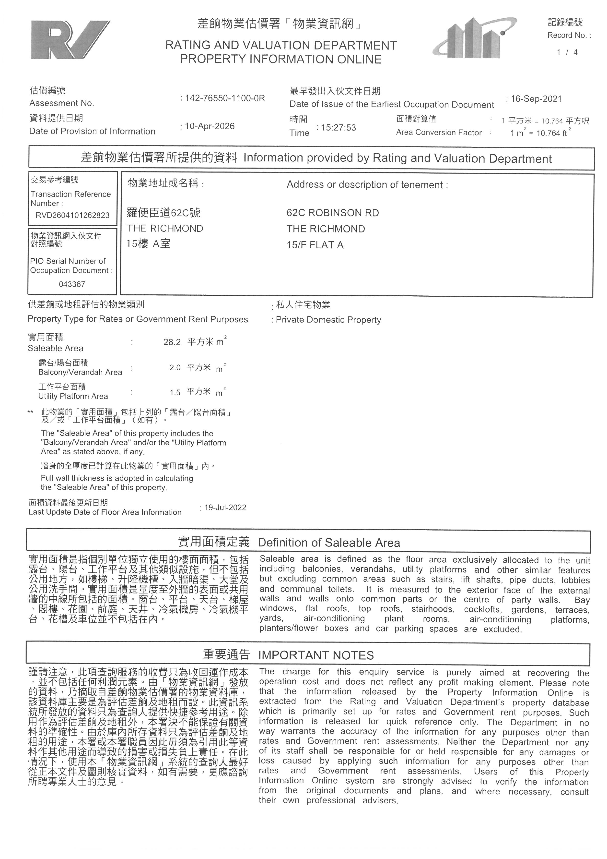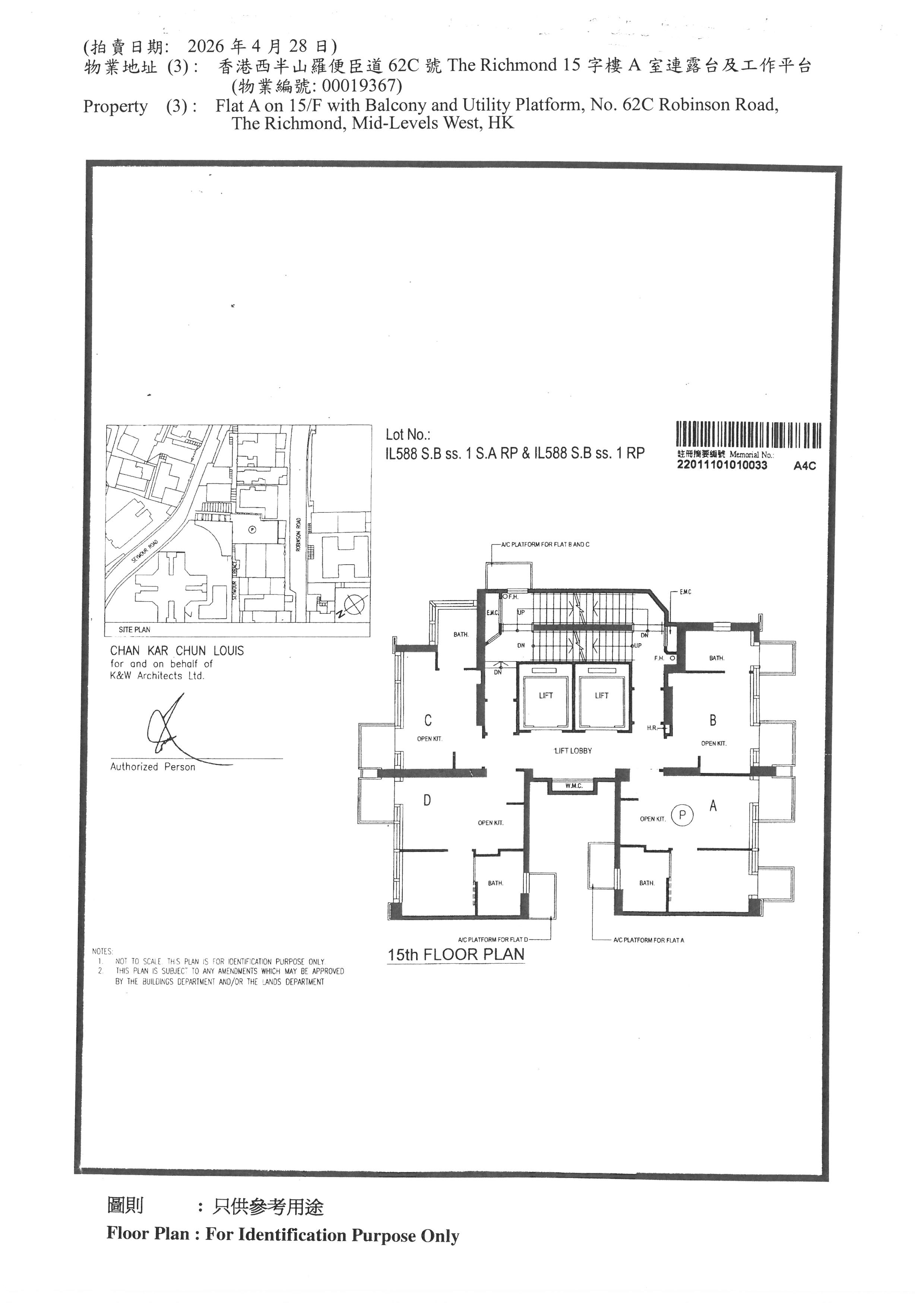 香港西半山羅便臣道62C號The Richmond 15字樓A室連露台及工作平台 (物業編號: 00019367)