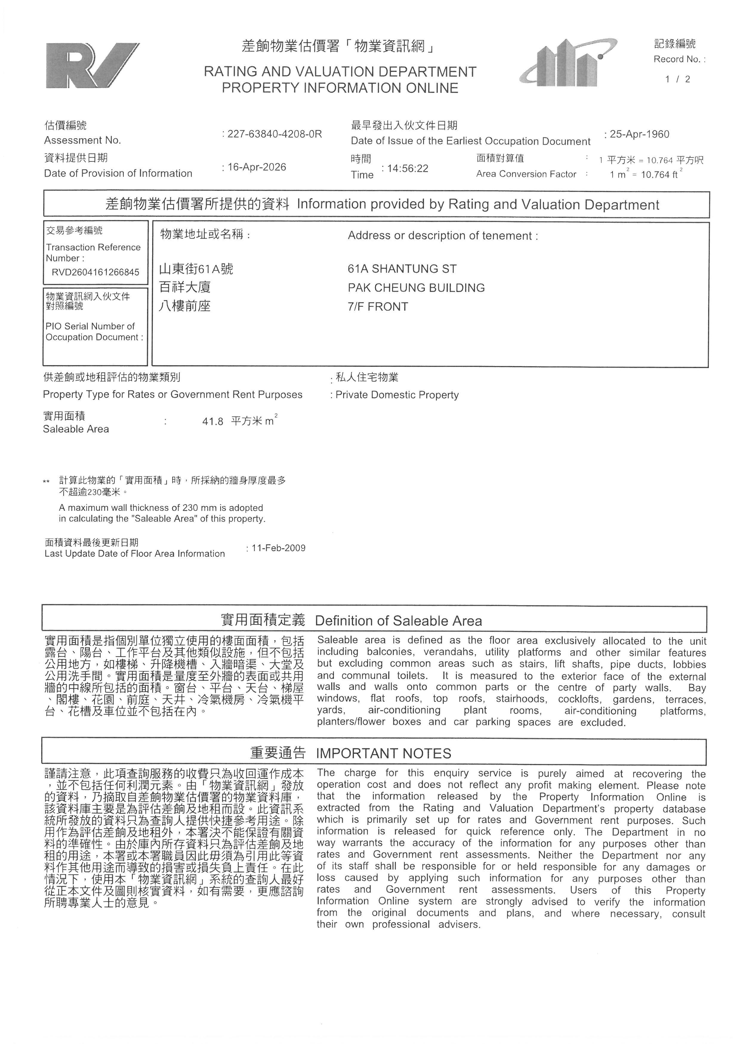 本網頁提供的物業資料只供參考之用,雖然本公司已盡力小心提供上述資料準確無誤,但本公司不會就本網頁所提供物業資料的任何錯誤、遺漏、失實陳述承擔任何保證及責任,本公司在任何情況下,都不須對因直接或間接使用或不能使用本網站提供的物業資料而引致任何損失或損毀負上法律責任或任何賠償。任何人仕必須明白及自行查證方作出競投、投買或購買,並於競投、投買或購買前由專業人仕(包括但並不謹限於律師、測量師及建築師等)獲取專業意見。