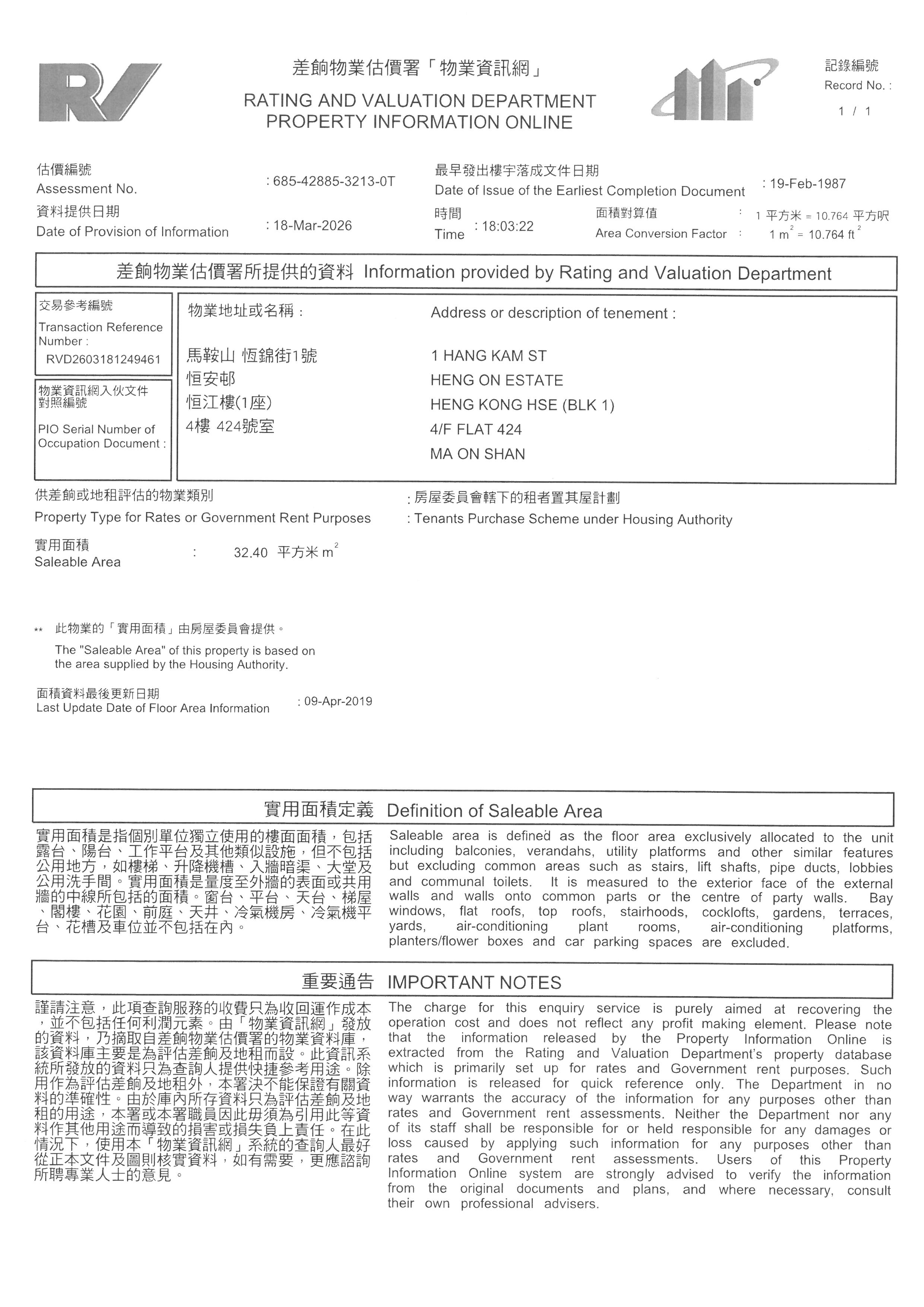 馬鞍山 恆安邨 1座 0424室 更新日期 : 2026-04-24